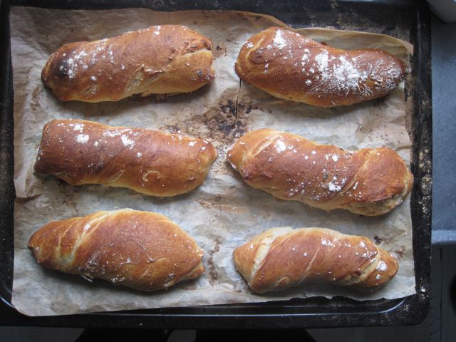 Kl. 07.28. Baguetterna såg lite trista ut i formen när jag klippte isär dem, så jag snodde dem försiktigt ett halvt varv. Får se hur det här blir nu då...Kl 07.50. Bra tips: klipp dem i 12 delar till frallor i stället, då blir gräddningstiden kortare. De här tog exakt 20 minuter och alla är väldigt hungriga. Är inte helt nöjd med hur de ser ut heller, blev inte så snygga som jag hade hoppats.