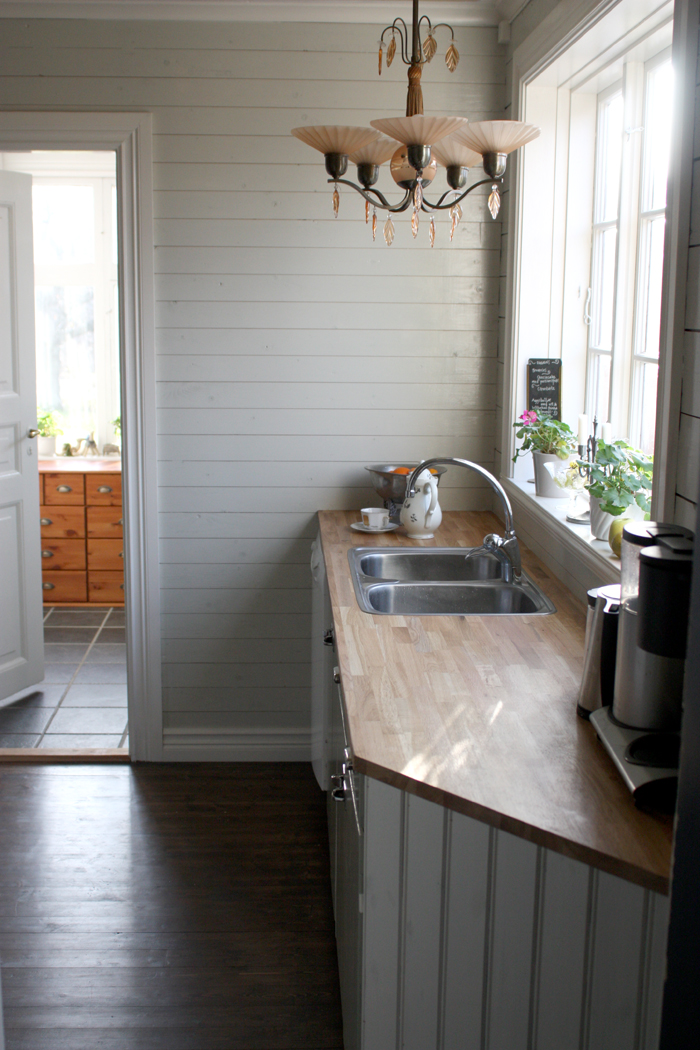 Nytt brädgolv, behandlat med Osmo dekorvax antik ek och sedan Osmo hårdvaxolja. Brädväggarna målade i pärlgrå och luckorna gröngrå. Allt annat antikvitt (taket är kvar att måla, men det orkade vi bara inte med i den här vändan).