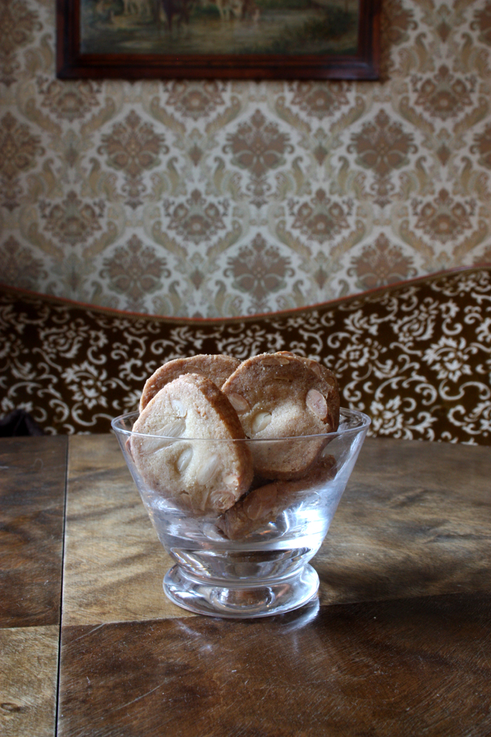 Blanda alla ingredienserna, mandlarna sist. Rulla ihop degen till två avlånga limpor som får ligga kallt över natten. Skär dem sedan med en skarp kniv i en halv centimeter tjocka skivor och grädda i 180-200°C i 10-15 minuter.
