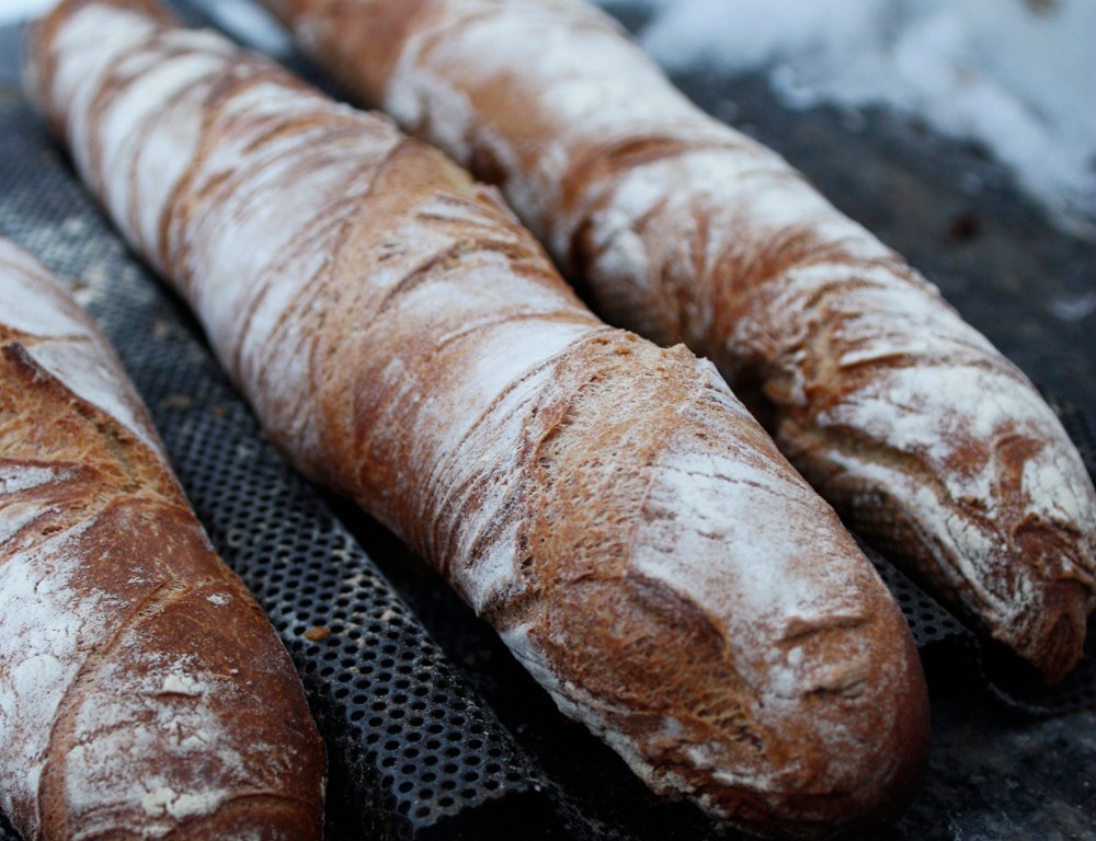 Sätt ugnen på 250 grader. Snitta baguetterna, sätt in plåten och spruta in vatten. Öppna ugnsluckan några sekunder och sänk till 225 grader efter 10 minuter. Lufta ytterligare ett par gånger under gräddningstiden, som blir cirka 25 minuter.