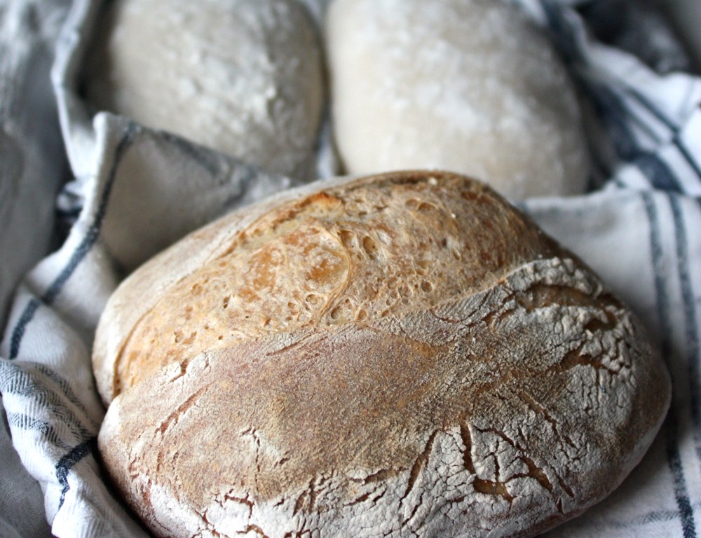 Den senaste tiden tycker jag inte att det har varit någon vidare sprutt i surdegen. Platta och trista bröd har det blivit. För att inte utsätta mig själv för ännu en brödbesvikelse satsade jag på säkra kort – vetemjöl och lite extra jäst. (Vete är det sädesslag som bildar längst glutentrådar och är lättast att lyckas med om man vill ha luftiga bröd med stora hål.) Jag lät bröden jäsa över natten på en plåt med mjölade linnehanddukar i kylen. Det blev väldigt gott. Och mycket fina små fiskbensmönster efter handduken.