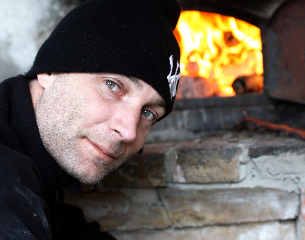 Vid 13.30 rakade vi ut glöden och svabbade stenarna med en blöt golvmopp (särskilt införskaffad för ändamålet vill jag bara understryka). Vi kastade in en näve mjöl för att bedöma ugnens värme, och såg direkt att det var för varmt. Mjölet blev svart på bara ett par sekunder. Förra gången vi bakade gjorde vi misstaget att försöka ändå. Nu lät vi luckan vara öppen och väntade 15–20 minuter innan vi langade in en pizza och lite småbröd. (En näve mjöl blev nu mörkbrun på ca 10 sekunder). Efter några minuter var pizzan klar, och vi bestämde oss för att sätta in lite större bröd.
