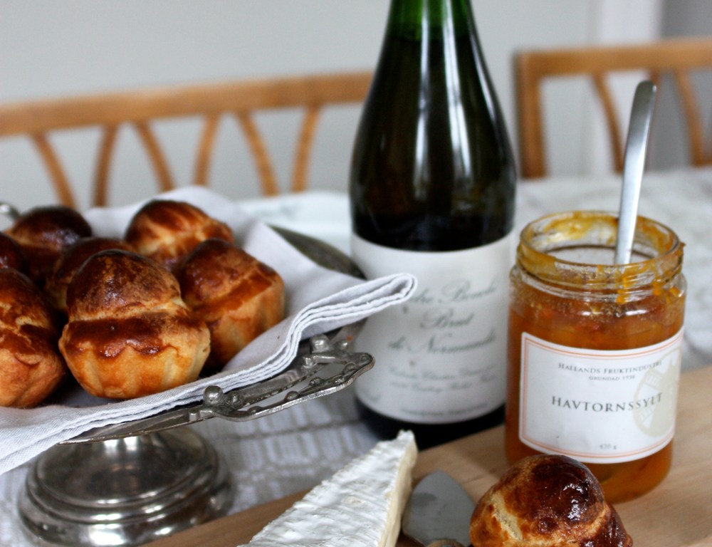 Vi hällde upp Cidre Bouché Brut de Normandie i de nya glasen, och avnjöt de nybakade briocherna (recept kommer snart!) med Brie de Meaux och havtornssylt från Hallands Fruktindustri. En helt sagolik kombination.