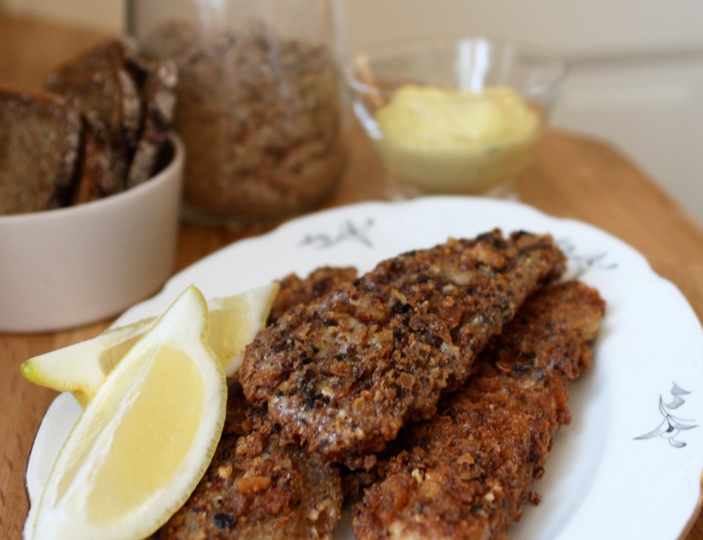 Det blev dansk frokost till middag ikväll. Vi håller på att ”äta upp frysen” som det heter, och längst in hittade jag en påse Alaska Pollock. Inte så väldigt upphetsande kanske, men som tur var hade jag sparat ihop till ett eget lyxigt ströbröd med smulor från alla mina bak. Det blev helt fantastiskt knapriga filéer, mycket krispigare än med vanligt ströbröd. De rara smulorna fäste väldigt bra på fisken trots att det var väldigt olika storlek på dem.