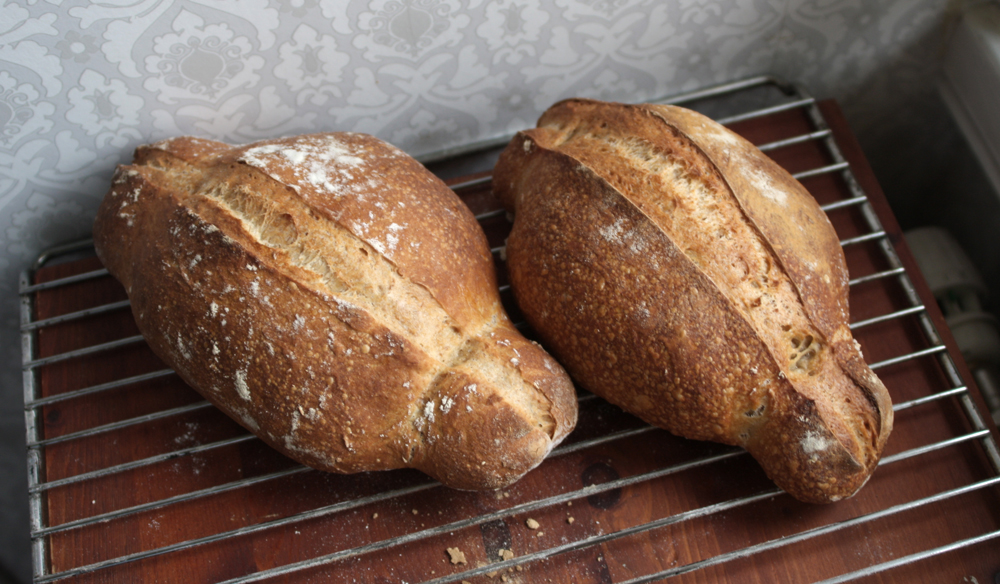 Två av bröden fick ligga på en mjölad plåt och jäsa i två timmar, sedan snittade jag dem på längden och gräddade i 250°C i 5 minuter, därefter i 225° i 30 minuter. Sprutade in vatten precis när jag satte in bröden och luftade några gånger under baktiden genom att öppna luckan.
