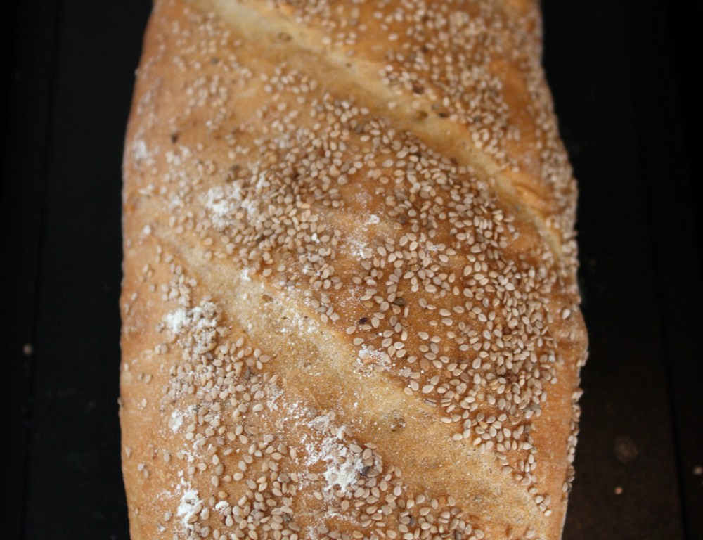 Franskbröd kan bakas ut på väldigt många olika sätt, jag valde att göra klassiska franskbröd med degvikt 400 g. Jag rundrev dem och lät dem vila 15 minuter på bakbordet, därefter plattade jag ut dem och vek dem som treslag. Jag slog till degen så att skarven fastnade i brödet ordentligt. Sedan fick bröden jäsa på mjölade handdukar med skarven neråt. Kanske borde de haft skarven uppåt, jag ska fråga Jan. Efter två timmar hade de fördubblat sin storlek. Jag penslade dem med vatten och strödde över sesamfrön.
