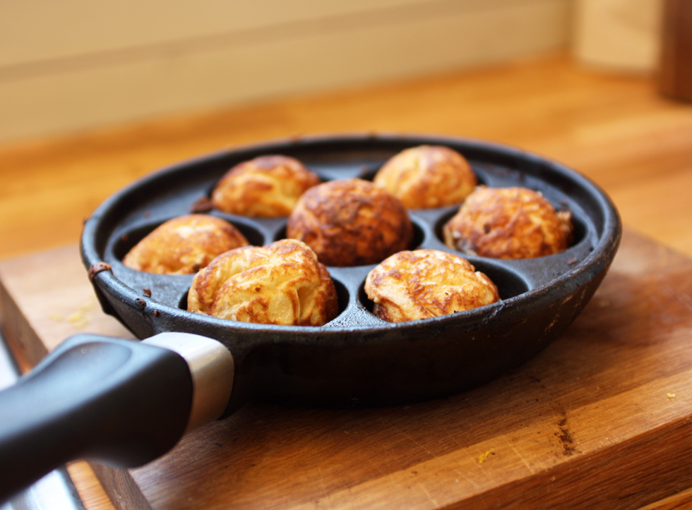 Blanda mjöl och äggulor. Sedan mjöl, salt, kardemumma, bakpulver och citronskal. Smält smöret och häll ner det i smeten. Blanda försiktigt i de vispade äggvitorna och låt smeten stå och dra i några minuter innan du börjar steka. Smörj pannan väl med smör. Fyll groparna med smet nästan ända upp. Bollarna ska vändas medan smeten fortfarande är rinnig i mitten. Använd en liten kniv eller tesked för att peta upp dem och flippa runt så att den rinniga smeten hamnar i botten på groparna. När den sväller bildas en rund boll. Stek tills de är genomgräddade och lägg dem i ugnen på svag värme så att de håller sig varma till serveringen. Det går också bra att frysa in dem och värma i ugnen när andan faller på.