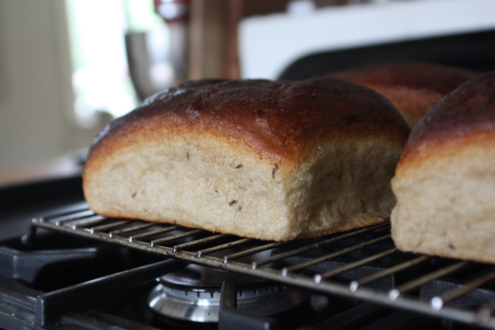 Sätt ugnen på 250°. Sätt in plåten och spruta in vatten. Sänk till 200° efter 5 minuter. Efter ytterligare 1o minuter, lufta genom att öppna ugnsluckan. Totalt ska bröden gräddas i 55–60 minuter, men jag upplevde detta som lite för länge. Kontrollera med termometer att innertemperaturen blivit 98°, det är extra viktigt med brödsorter som innehåller mycket vatten.