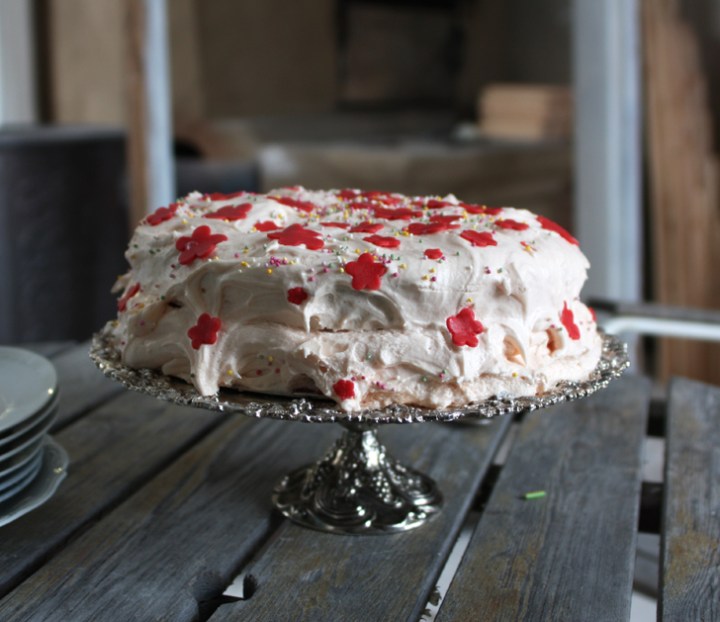 Sådär! Täck nu den ena tårtbottnen innan du lägger på den andra och klär in hela härligheten i frosting. Några röda marsipanblommor och strössel piggar ju såklart upp, liksom födelsedagsljus och en rejäl stämsång!”