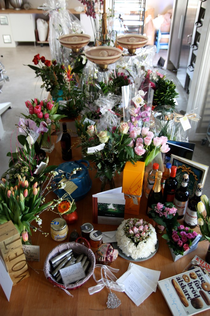 Så här såg det ut i bageriet dagen efter festen i fredags. 46 blomsterarrangemang, ett antal flaskor innehållande allt från champagne till balsamterpentin, och många andra fina presenter.