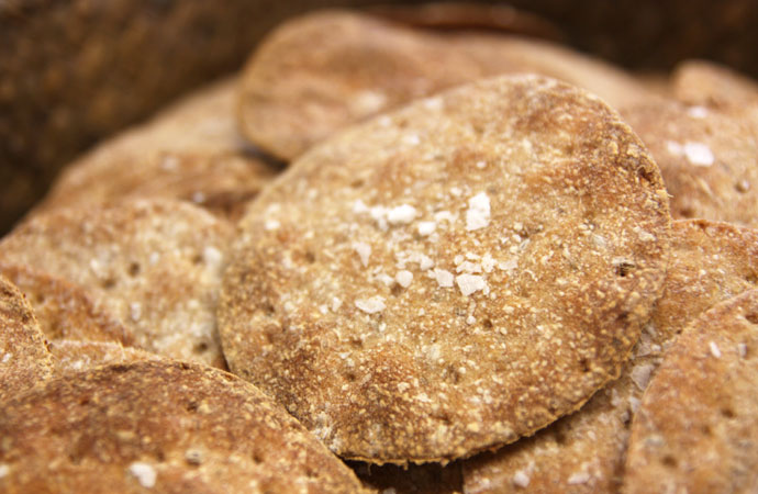 Blanda allt på lägre hastighet i 5 minuter och på hög hastighet i 5 minuter. Täck över och låt degen vila en timme. Dela i bitar och kavla ut tunt, cirka 1 millimeter, spraya på vatten och strö lite flingsalt över. Stansa eller skär bitar som du lägger på plåt med bakplåtspapper. Grädda i 240° i cirka 10 minuter, här får man vara lite uppmärksam så att det inte blir bränt. Konsten är att kavla riktigt jämnt.