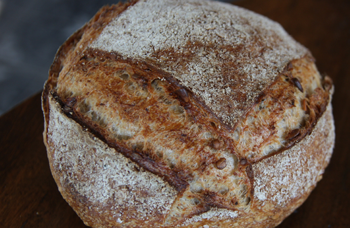 Värm ugnen till 250°. Vänd upp bröden på en lätt mjölad brödspade eller en platt skiva av något slag. Snitta med en vass kniv eller rakblad. Spruta in vatten samtidigt som du sätter in bröden och sänk värmen till 230°. Grädda i 35–40 minuter eller till en innertemperatur på 98°.