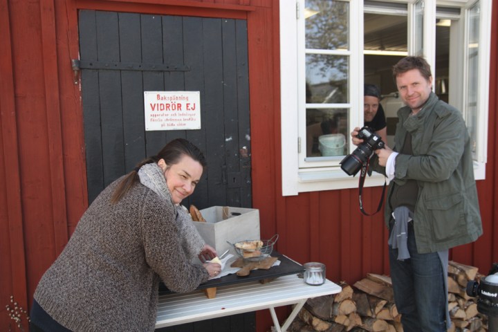 Stylist Ellinor Störby och fotograf Magnus Carlsson arrangerar stilleben med baguetter, medan bagerichef Gustav Fagerman övervakar det hela genom fönstret. Resultatet får ni se och läsa om i sommarnumret av Gourmet.
