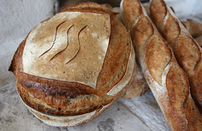 Värm ugnen till 250°. Vänd upp bröden på en lätt mjölad brödspade eller en platt skiva av något slag. Snitta en fyrkant med en vass kniv eller rakblad. Spruta in vatten samtidigt som du sätter in bröden och sänk värmen till 230°. Grädda i 40–45 minuter eller till en innertemperatur på 98°.
