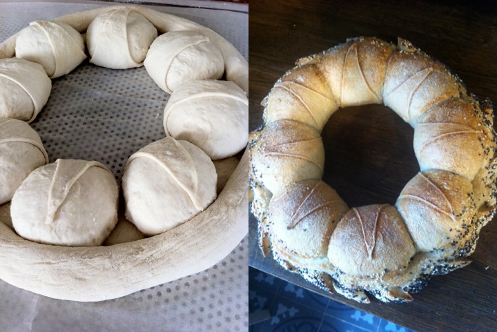 Blanda allt utom salt i degblandare på låg hastighet i cirka 10 minuter. Sedan med saltet på lite högre hastighet i ytterligare 5 minuter. Lägg degen i en inoljad plastlåda med lock, och låt den vila i 90 minuter. Vik ihop en gång efter halva tiden. Dela degen två bitar, rundriv och lägg med skarven uppåt på mjölad handduk. (Vi gjorde dem lite större, 1500 g styck.) Låt stå tills de har jäst lagom, eller ställ in i kylen om du vill baka dem nästa dag.