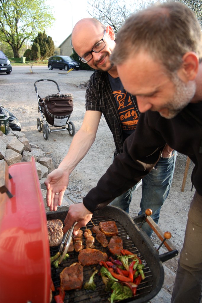 Tur att man har goda grannar som våldgästar med grill. Daniel från Slöinge Pensionat och min Ante grillar.