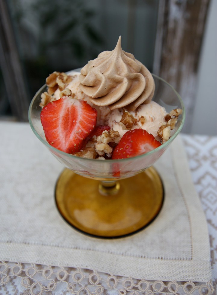 Farinmaräng med SIA Apelsinchoklad, jordgubbar och hackade valnötter