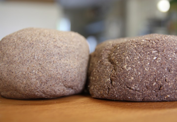 Det går inte heller att bara gå ut i skogen och bryta loss vilken bark som helst. Nej, det ska vara späd bark, gärna från tall. Först kokar man den, sedan torkas den och mals till ett brunt pulver med ganska besk smak. Av detta gjorde jag två olika knäckedegar med olika halt av barkmjöl.
