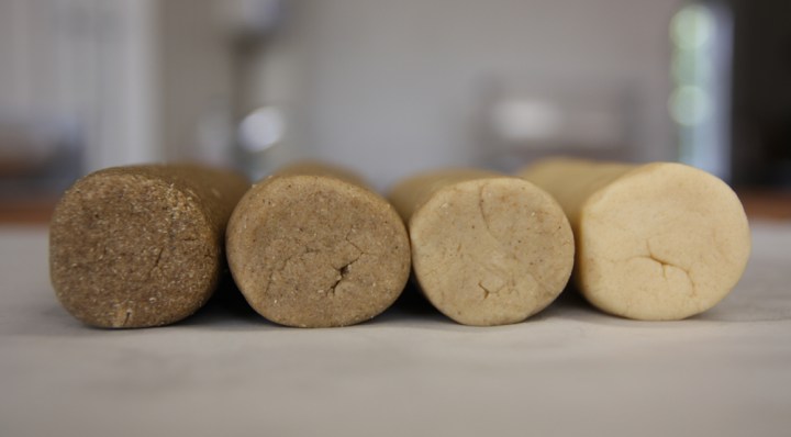 Kakrullar med 100, 60, 40 och 0 procent kvickrotsmjöl. Jag skivade upp dem och bakade av i 200° i cirka 10 minuter.