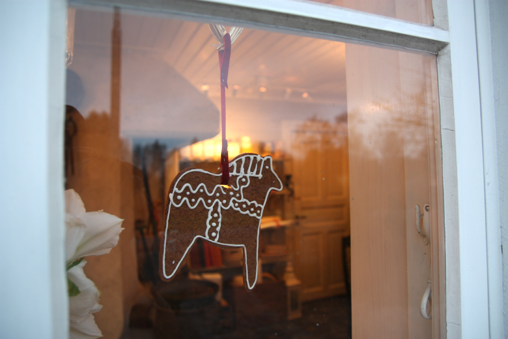 Nu har julen börjat på Solhaga, tyvärr med att jag kom ut i morse och upptäckte att hälften av de fina pepparkaksfigurerna jag hängde upp i går nu hade trillat ner. Det blir så fuktigt i bageriet av all ånga från ugnen att kakorna mjuknar och går sönder. Men några hängde kvar. Nästa vecka gör jag nya som ska sprayas med lack för att hålla hela december. Jag har dekorerat dem på båda sidorna för att de ska vara fina både inne och ute.