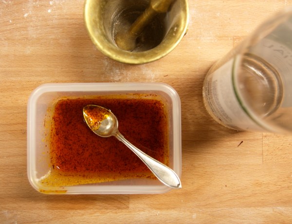 Stöt saffran och socker i mortel. Häll över i en burk och tillsätt spriten. Rör om och låt dra minst ett dygn innan baket. Det här räcker till en lussedeg om du vill ha mycket färg och smak, men det går självklart att bara använda ett par teskedar och spara resten till paella, fisksoppa, saffransbiscotti eller vad annat du vill hitta på.