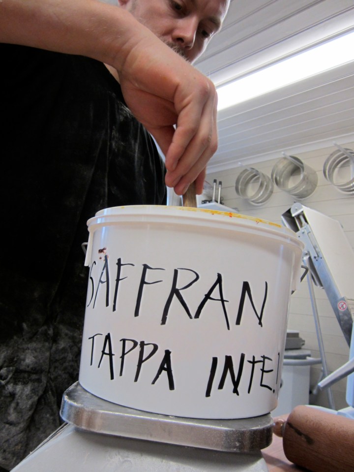 I bageriet jobbar vi med saffranshink modell större. Det går åt uppåt 150 000 blommor för att göra 1 kilo saffran, därav varningstexten på hinken.