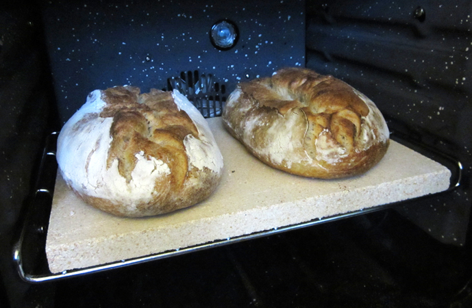 Bakstenarna som vi säljer här i bageriet (kostar 300 kr) har vi köpt av John Fisher som bygger moderna vedeldade stenugnar. Det är ett slags keramisk sten som han lägger in i botten på ugnarna. De är porösa ungefär som tegel, så undvik att tappa den i golvet. Det går också bra att gå till närmaste stenhuggeri och be om en lagom stor skiva i granit. Och har du ingen sten kan du skjutsa in bröden direkt på en varm plåt, inte riktigt samma effekt men en bra nödlösning.