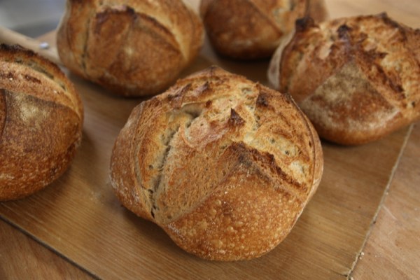 Låt degen vila i en plastlåda med lock i cirka 120 minuter, stöt samman degen en gång under tiden. Dela degen i tre bitar om cirka 700 gram. Eller gör ett jättestort bröd av hela degen, som på bilden ovan. Rundriv eller forma till limpa, och lägg med skarven uppåt på en bricka som du mjölar med ett grövre mjöl, vi använder grahamsmjöl. Låt bröden jäsa några timmar i rumstemperatur eller en natt i kyl.
