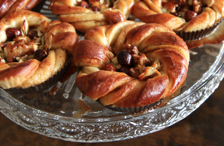 Dela degen i två bitar, vik ihop dem till jämna klumpar som du låter vila i kylen i 30 minuter. Detta gör att degen spänner av och går lättare att kavla. Kavla ut varje degbit till en platta som blir cirka 40 cm bred. Bred på generöst med fyllning och vik ett treslag – degen ska bilda tre lager. Skär i strimlor, 60–80 gram styck eller ca 15 strimlor för varje längd. Tvinna strimlan och gör en liten knut. Lägg knutarna i bullformar på plåt och lämna rejält med utrymme mellan dem. Upprepa hela proceduren med nästa klump deg.