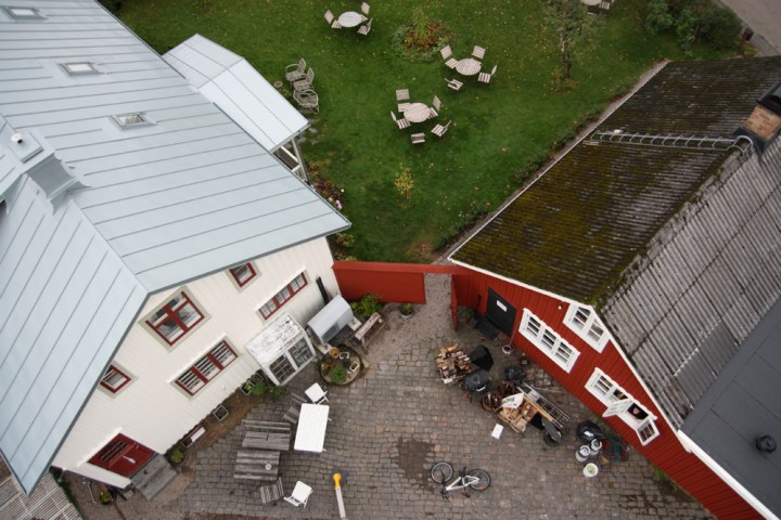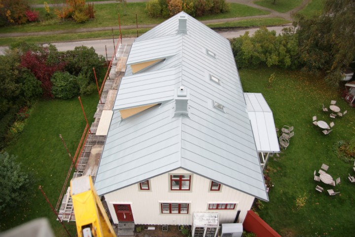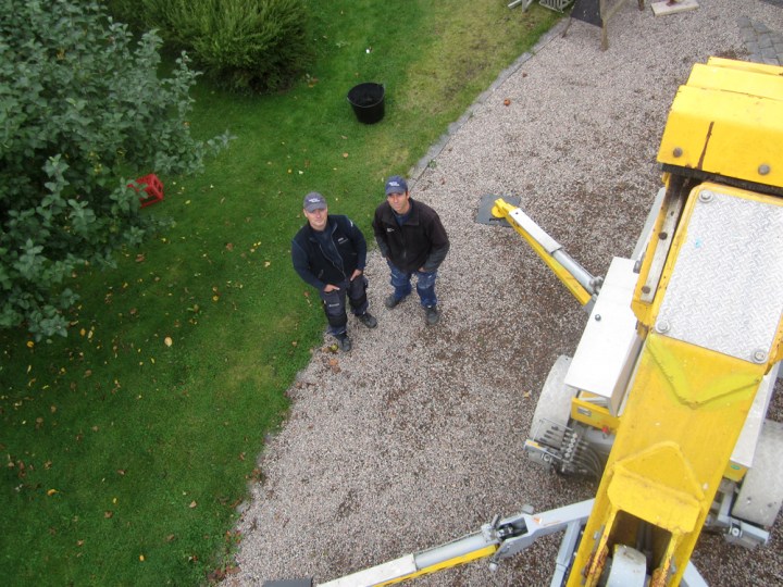 Det är Ola och Mats på Falkenbergs plåtslageri som under de senaste veckorna har hamrat ihop detta mästerverk i rheinzink. För att fira bjöd killarna oss alla i bageriet på en åktur i kranen. Här är vi på väg upp.