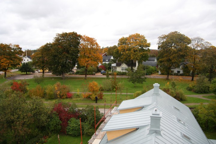 Vackra höstfärger i Järnvägsparken. Huset har numera två skorstenar precis som i original.