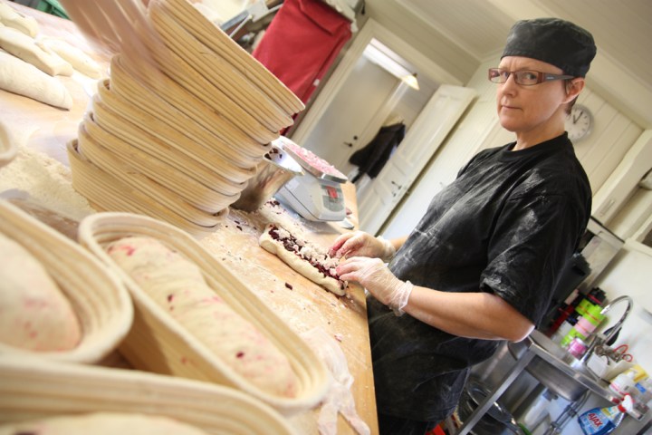 Låt degen vila i en plastlåda med lock i cirka 120 minuter, vik ihop degen två gånger under tiden. Dela degen i tre bitar på cirka 500 g och töj varje bit till en liten rektangel. Strö på hackade rödbetor och smulad chèvre (cirka 50 gram per bröd) och rulla ihop. Mjöla lite i skarven, och lägg limporna med skarven neråt i mjölad korg. Låt bröden jäsa några timmar i rumstemperatur eller en natt i kyl.