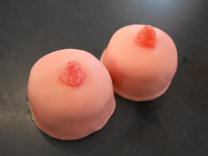 Sedan dess har historien om veckans bröst varit en klassiker, som vi nu tänkte närma oss från ett lite allvarligare håll. Just nu pågår ju Rosa Bandet-kampanjen till förmån för Bröstcancerfonden, och på något sätt vill vi gärna bidra. Därför har vi nu bakat en liten prinsessbakelse med rosa marsipan och geléhallon på toppen. Inkomsterna från försäljningen går oavkortat till Bröstcancerfonden.