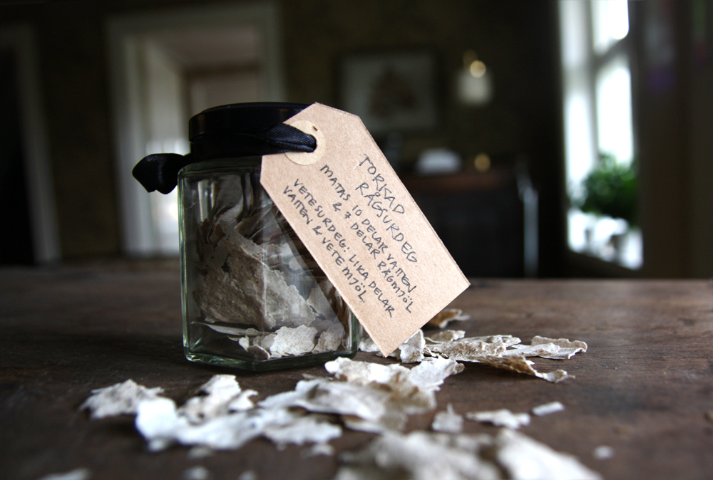 Om du tycker att det blir för ansträngande att tänka på din surdeg hela tiden, smeta då ut lite grann tunt på ett papper. Låt torka och förvara smulorna i en burk. Sedan kan de ligga där hur länge som helst, kanske för evigt. Och närhelst du vill kan du väcka surdegen till liv med nytt mjöl och vatten, visst är det fint?