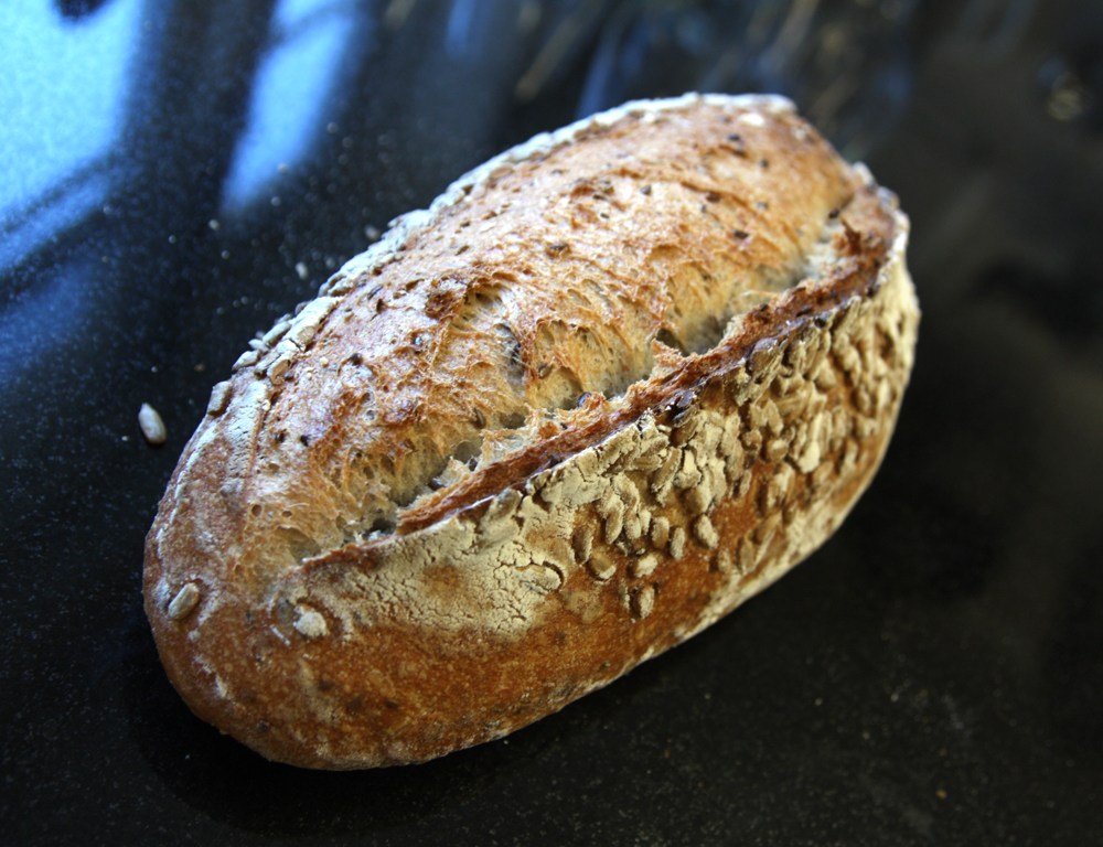 Låt degen vila i en inoljad plastlåda i cirka 2 timmar, vik ihop en gång under tiden. Häll ut degen på mjölat bakbord och dela i två bitar. Forma till limpor, spraya den släta sidan med vatten, doppa i solrosfrön och lägg med skarven uppåt på bricka eller duk som du mjölar med grovt rågmjöl.