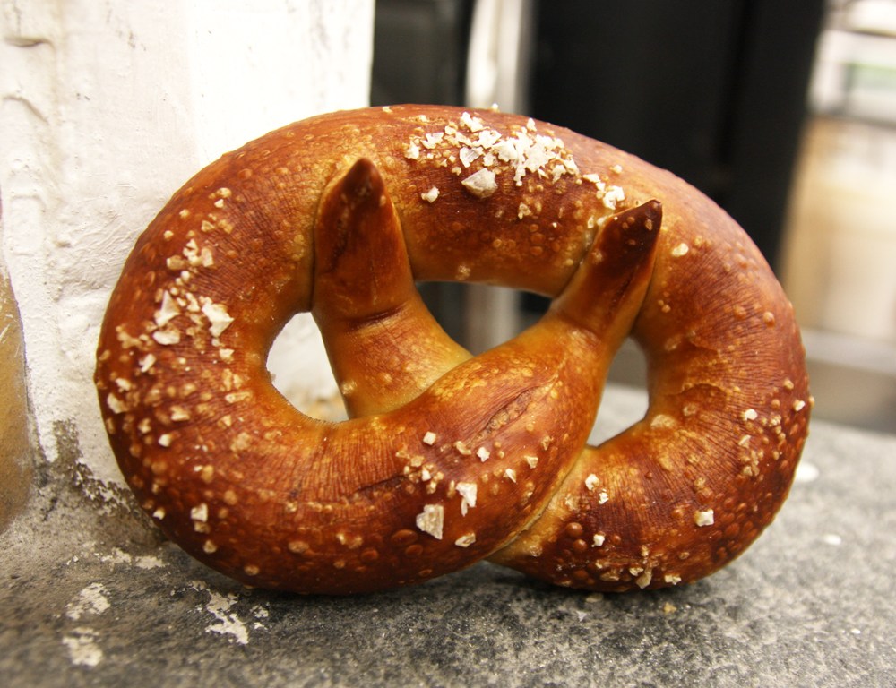 Degen doppas i en uppvärmd lag på vatten och kaustiksoda och beströs sedan med flingsalt för att få den rätta pretzel-ytan. Jag vet inte hur berusad personen som kom på det här med kaustiksodan måste ha varit, men i vilket fall passar detta bakverk fantastiskt bra till just öl. Dessutom är det ju så oerhört praktiskt att man får avloppet rengjort efteråt genom att hälla lagen med kaustiksodan rätt ner i vasken.