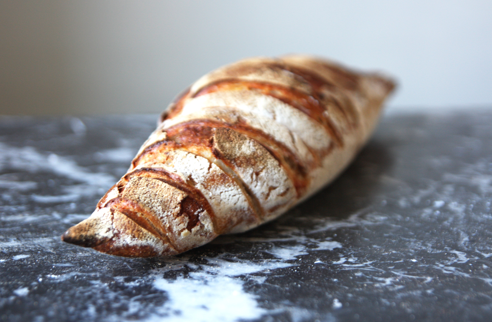 Låt degen vila i en plastlåda med lock i cirka 90 minuter, stöt samman degen en gång under tiden. Dela degen i fyra bitar. Forma till knubbiga baguetter som du spetsar till i ändarna och lägger med skarven uppåt på en bricka som du mjölar med vetemjöl. Låt bröden jäsa några timmar i rumstemperatur eller en natt i kyl.