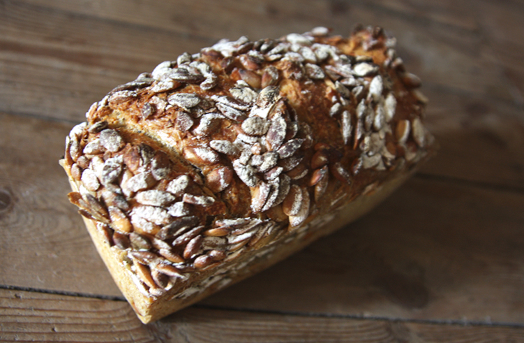 Här har vi ett ljust och gott bröd, med malda pumpakärnor som ger en lite grönaktig ton åt innehållet. Kanske kan passa nu när våren troligtvis är på väg.