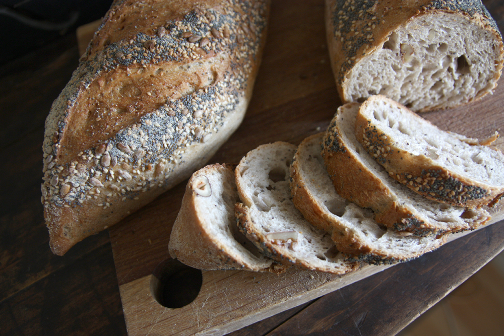 Låt degen vila i en inoljad plastlåda i cirka 2 timmar, vik ihop en gång under tiden. Häll ut degen på mjölat bakbord och dela i tre bitar. Forma sedan till avlånga limpor och lägg med skarven uppåt i duk som du mjölar lite lätt med vetemjöl.