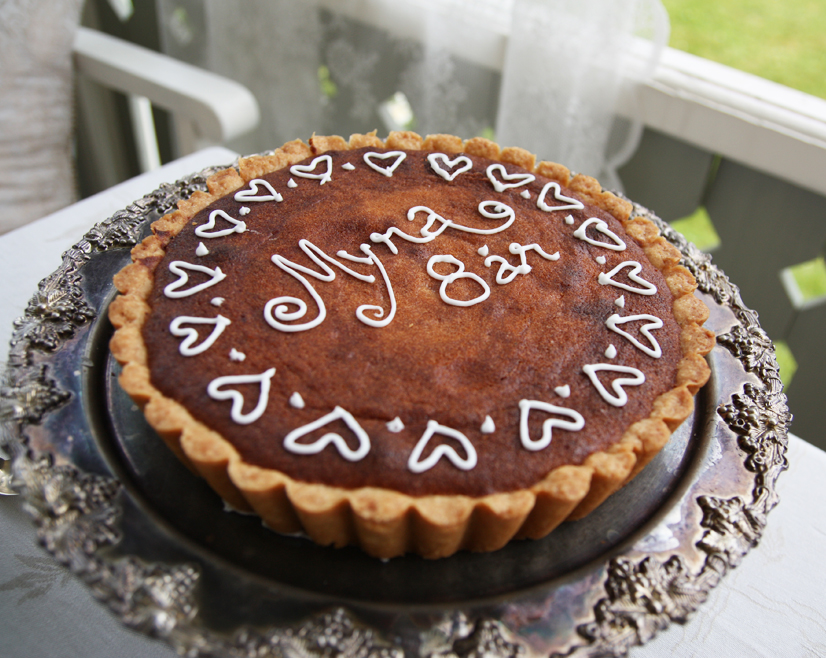 Mitt i varmaste juli fyller vår Myra Juli Wennerström år. Hon får önska sig ett bakverk såklart, de senaste åren har det varit Hello Kitty-tårta, Ponnyslottstårta och Churros. I år ville hon ha en pepparkakstårta, och eftersom hennes ord är lag blev det en tarte med mazarinfyllning och smak av julens kryddor.