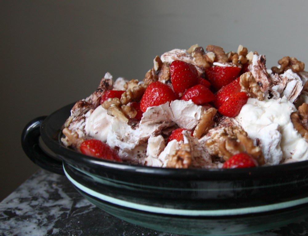 Här är min egen variant på marängsviss, bestående av chokladmaränger, vaniljglass, lättvispad grädde, jordgubbar och valnötter. Jag är inte särskilt förtjust i att hälla chokladsås över glassen, därför bakar jag hellre in chokladen i marängerna.