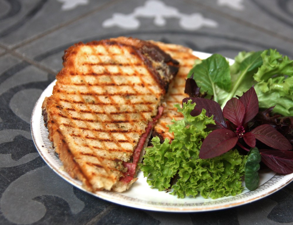 Till lunch blev det Solhagas varma grillmacka som vi kallar Mostorp. Det är verkligen ett superbra tips på vad man kan göra med levainbröd som börjar bli lite torrt och tråkigt. Faktum är att det blir mycket stabilare grillmackor med ”gammalt” bröd, och det är lättare att skära i tunna skivor.