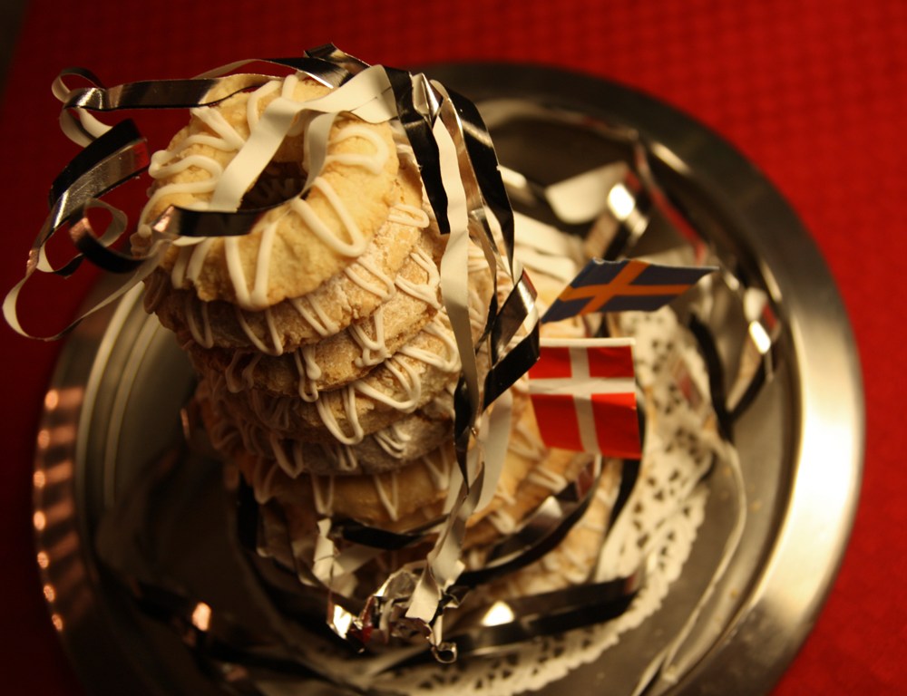 Baka i 200°C i cirka 8–10 minuter till gyllene färg. Var noga med att inte baka för länge, kakorna ska vara sega inuti. Spritsa glasyr på ringarna när de har svalnat enligt det klassiska mönstret på bilden. Låt torka och bygg sedan upp till ett torn. Dekorera med danska flaggor.