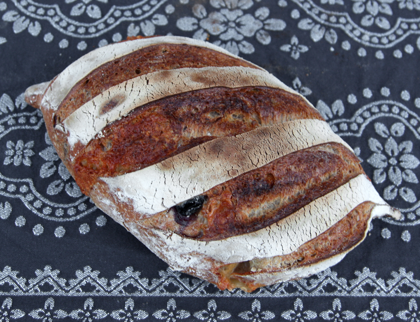 Låt degen vila i en plastlåda med lock i cirka 120 minuter, pressa ur luften och vik ihop den till ett paket efter halva tiden. Dela degen i tre bitar. Forma till limpor med lite spets och lägg med skarven uppåt i mjölad duk. Dra upp duken mellan bröden så att de stöttar varandra under jäsningen. Baka av efter jäsning i rumstemperatur, eller kalljäs över natten.