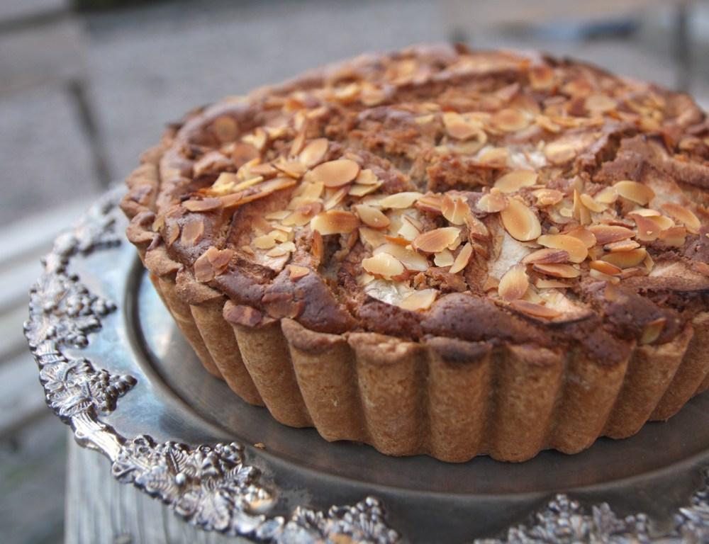 Häll smeten i pajskalet. Dekorera med tunna äppelklyftor och flagad mandel. Grädda i 200° tills den är klar, cirka 40 minuter, men det kan ta upp till en timme. Sätt i så fall aluminiumfolie över den sista kvarten så att kakan inte blir för mörk.