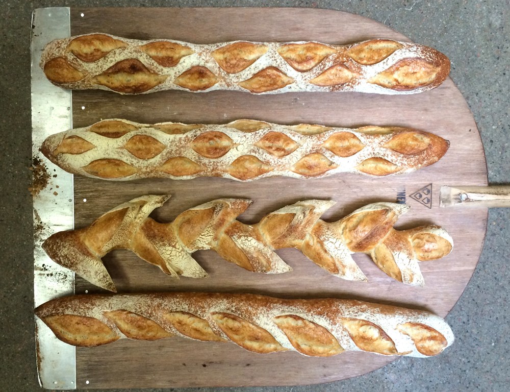 Den översta bilden visar klassiska snitt, som ger det fina mönstret med bladformade öppningar. Allra finast kontrast blir det om du siktar lite mjöl över baguetten precis innan du snittar.