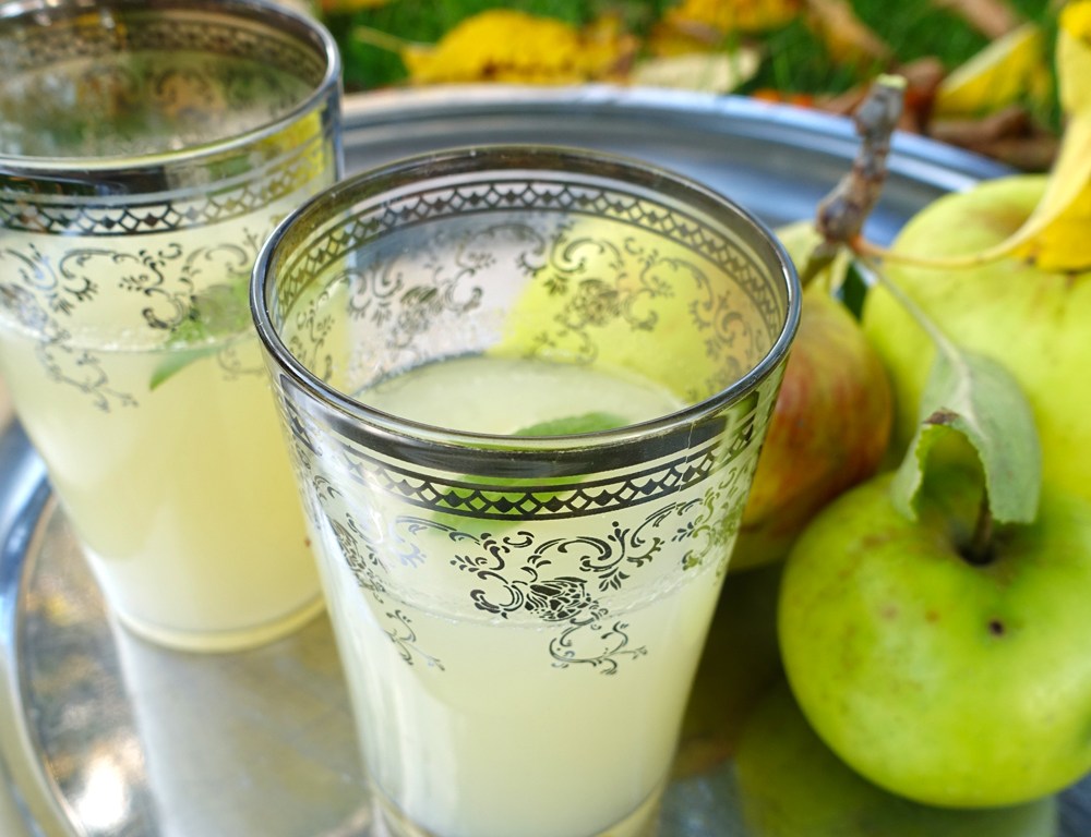 Saften från äpplena blir en lätt sötad äppelmust. Den ska stå och dra till imorgon med några kvistar citronverbena. Väldigt god både varm och kall.