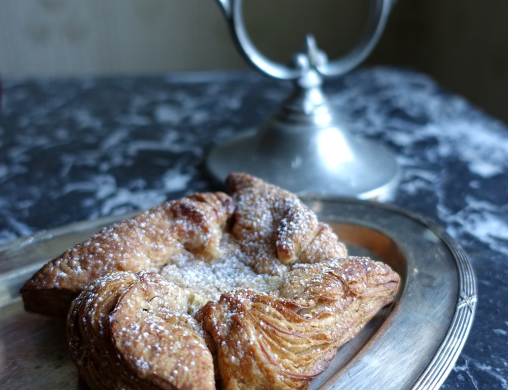 I fredags var det min tur att bjuda på fredagsfest på Solhaga – det vill säga hitta på något nytt. Och eftersom det denna söndag är wienerbrödets dag och inte långt till jul ville jag slå samman alla dessa festliga händelser genom att göra ett wienerbröd som passar årstiden. Jag kallar dem julstjärnor, fast jag vet att det redan finns ett bakverk som heter så, med smördeg och katrinplommon. I min tolkning är grunden en wienerdeg, smaksatt med pepparkakskryddor, fylld med en remonce på egen mandelmassa, smör och äppelpuré på äpplen från Solhagas trädgård.