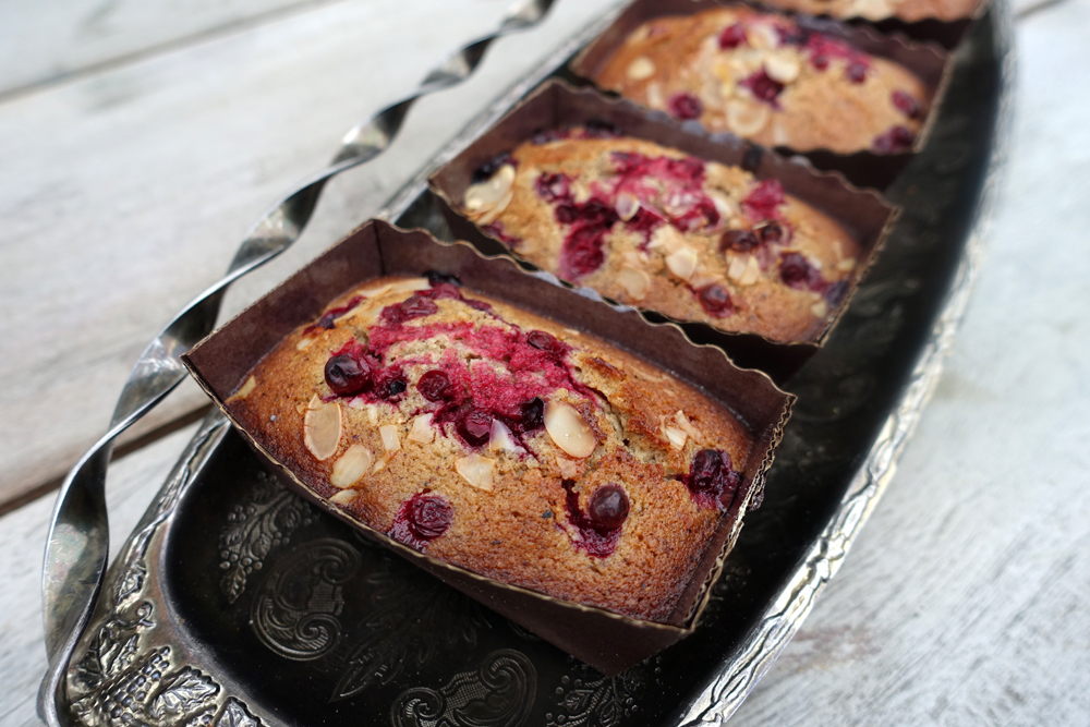 Spritsa ut smeten i muffinsformar eller liknande. Fyll först botten av formen, lägg dit några lingon, och sedan smet tills det fyller 3/4 av formen. Strö över lingon som dekoration och toppa med flagad mandel. Baka i 225°C i 13-16 minuter, tills det är fin färg på ytan.