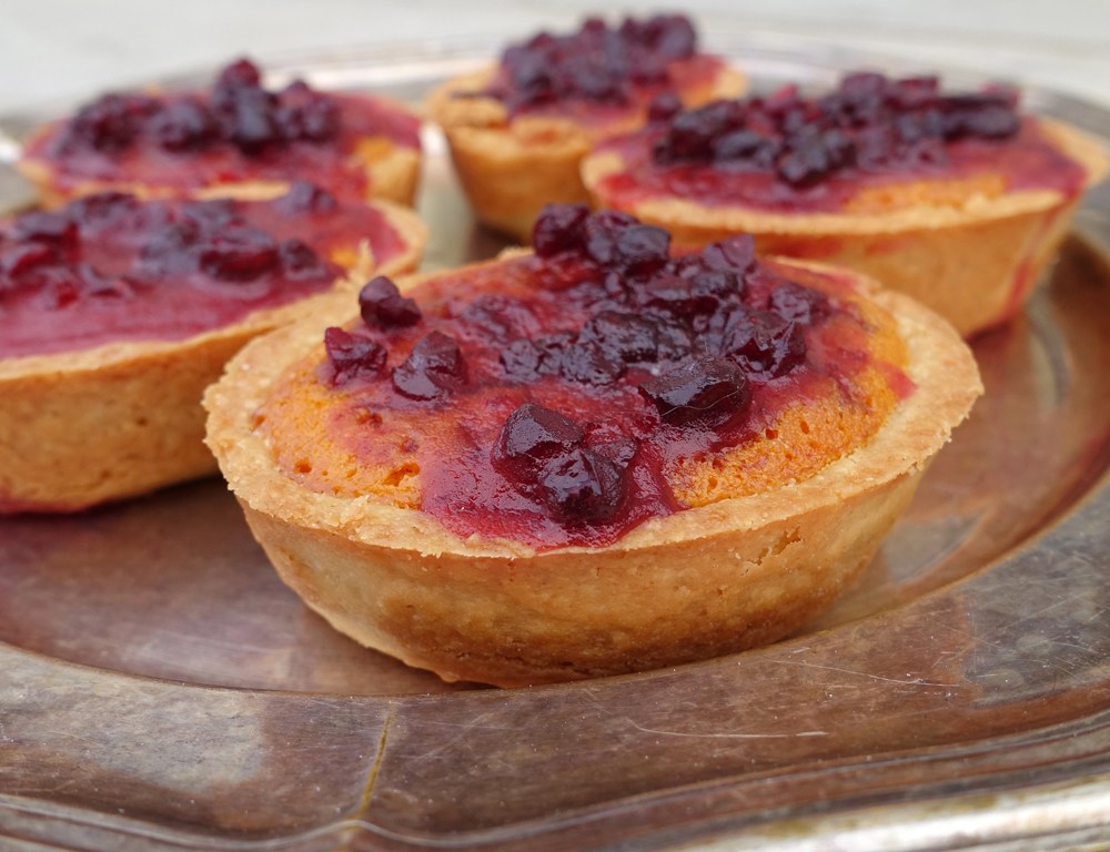 Baka i 200° i cirka 15-20 minuter tills kanten har gyllene färg. Låt svalna, stjälp upp mazarinerna ur formarna och dekorera med lingon.